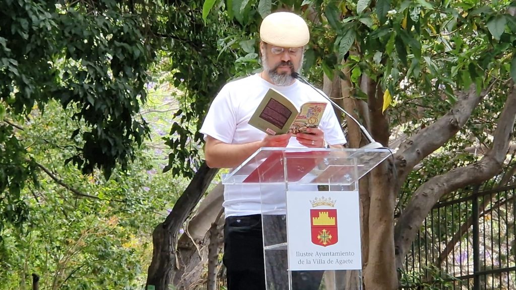 EL AUTOR Y LAETITIA. Un momento de la lectura de uno de los poemas en la II Feria de Escritores, en Agaete (Gran Canaria).